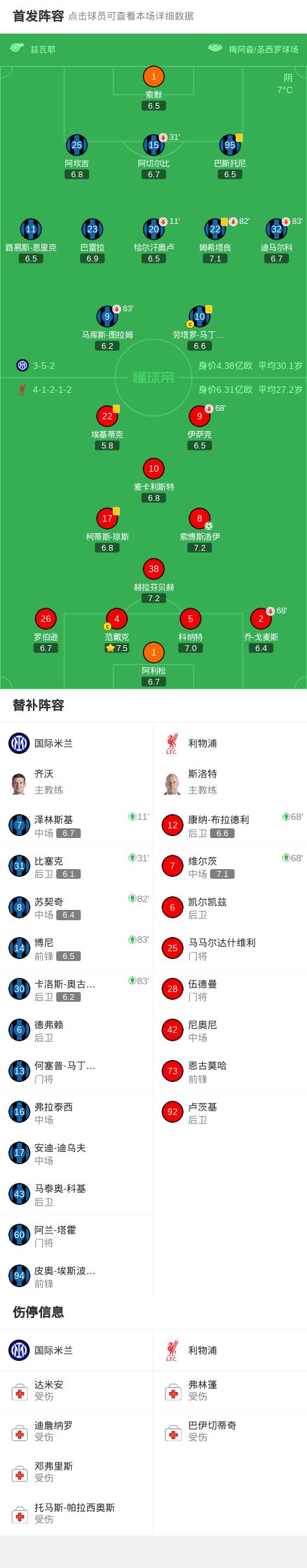 在欧洲冠军联赛联赛阶段第6轮的较量中,国际米兰迎战利物浦。上半场恰尔汗奥卢、阿切尔比伤退,科纳特头球破门被吹,劳塔罗头球被阿利松扑出,下半场布拉德利打门造险,索博斯洛伊点射破门。全场比赛结束,最终比分为国际米兰 0-1 利物浦。